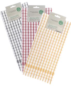 A double pack of eco-friendly terry tea towels — all yarns are made from recycled materials. Soft, absorbent and with a chequered design.